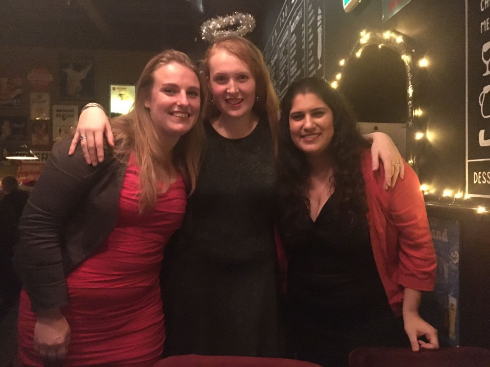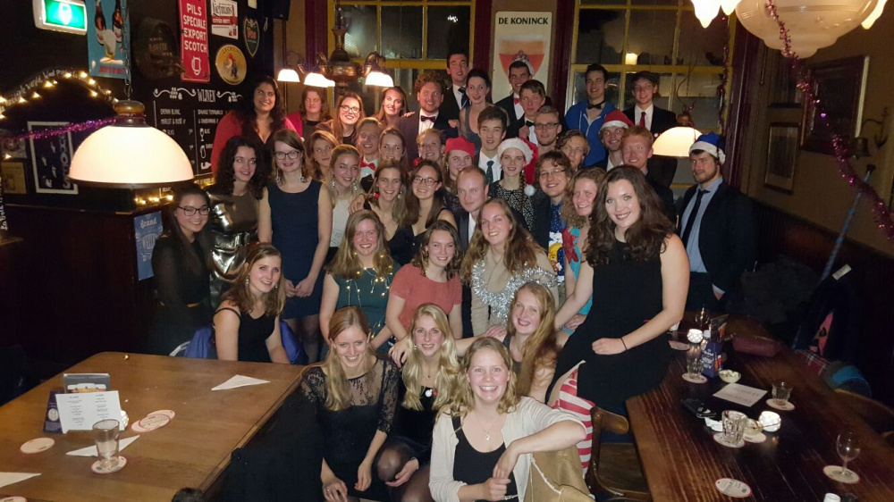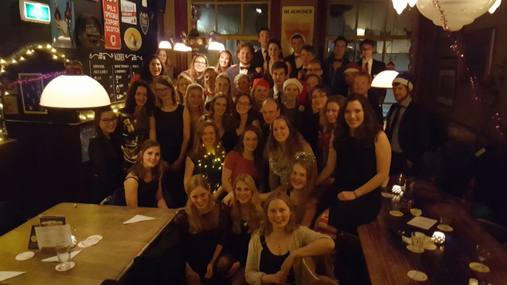Het was een prachtige verzameling Schuiters die zich helemaal naar het thema hadden gekleed, Black tie met kerstdetail. Onze voormalige soosbaas had de memo van het thema alleen even gemist en kwam in een spijkerbroek en hoodie aan in het restaurant. Na een ruime inloop zocht iedereen een plekje en werd het menu grondig bestudeerd. Na het bestellen werd het eten al snel geserveerd maar voor we met eten konden beginnen moest het diner natuurlijk geopend worden met een mooie speech van onze geliefde praeses Florianne. Na wat gestuntel met een laag hangende lamp had onze praeses haar plekje gevonden en stak ze van wal. Ze hield het kort want er waren nog meer speeches, maar ze wensten iedereen alvast een fijne kerste en een gelukkig nieuwjaar.
