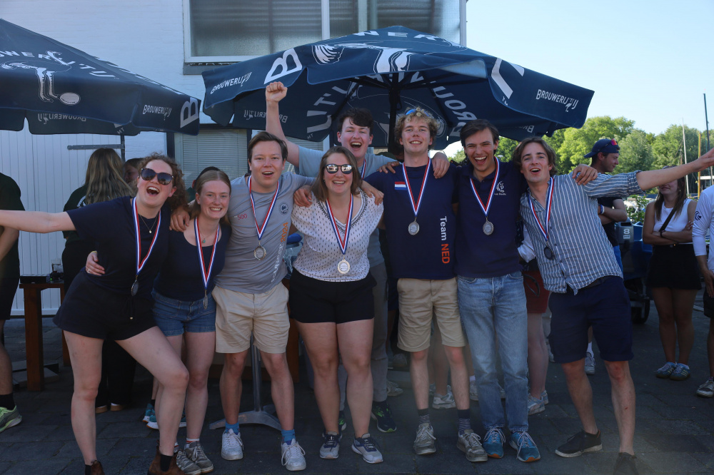 Toen werd het al gauw tijd voor de finale: een best of 3, RSZV tegen de Blauwe Schuit. RSZV, de topfavoriet, zat ons gelijk op de hielen. De eerste wedstrijd kon alle kanten op gaan. Snelle manoeuvres, tactische hoogstandjes en een draaierige wind zorgden voor een heus spektakel. De eerste wedstrijd werd, met een ware fotofinish tussen 3 van de 4 boten, gewonnen door ons! We konden de trofee al ruiken… Het was echter nog lang niet uitgespeeld. De tweede wedstrijd was weer bloedstollend. We gingen nek aan nek, soms met millimeters tussen de boten. We hebben helaas net toe moeten geven aan het tactische expertise van dit topteam. We wisten weer waarom ze de favorieten waren. De derde wedstrijd was aangebroken. Uit de boot zagen we botenvol toeschouwers aan het juichen om de geweldige wedstrijden. Onze hartslag ging om hoog en de druk was groter dan ooit. De start ging helaas niet heel goed. De spanning bracht wat kwaaltjes in ons zeilen. We hebben een hele tijd vlak achter de boten van RSZV gevaren en hebben alles uit de kast getrokken om ze te verslaan, maar uiteindelijk waren deze ervaren zeilers toch een maatje te groot voor ons. Wij kunnen echter trots zijn om in dit veld vol topteams onszelf 2e van Nederland te mogen noemen. Een weekend vol zon, zeilen, zuipen en we vertrekken met opgeheven hoofd terug naar Leiden, met allemaal een zilveren plak om onze nek.