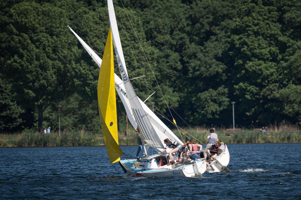 De volgende ochtend was wat minder gezellig. De wekker ging vroeg en sommigen van ons hadden wel heel diep in het glaasje gekeken. De kater werd gelukkig al gauw vergeten aan het ontbijt in het zonnetje met uitzicht op de Kralingse Plas. Al gauw werd het tijd… er moesten nog vier races gevaren worden en met een spannende tussenstand waar de top 4 binnen 2 punten van elkaar stond, was er nog alles om voor te varen. Vier wedstrijden, vijf overwinningen…? Tijdens de wedstrijd tegen broach ging het er hard aan toe. We zijn uiteraard altijd bloedfanatiek in de strijd tegen onze delftse rivalen, maar nu gingen beide teams tot het gaatje. De wind trok aan en we gingen nek aan nek. Na de tweede bovenboei lagen we er heel goed voor, maar tot onze schrik zagen we dat de zijstag van een van de Broach boten eruit was geklapt. Helaas moest daarom de wedstrijd opnieuw gevaren worden. Maar de formule bleef hetzelfde, waardoor we (weliswaar ternauwernood), voor Broach zijn gefinisht. Deze ochtend hebben we afgesloten met 4 overwinningen, wat betekende dat we als 2e boot door mochten naar de halve finale! We moesten weer tegen Broach en wisten ze weer de baas te zijn.